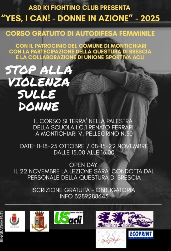 È denominata "Yes, I can" la nuova iniziativa promossa dall'associazione sportiva K1 Fighting Club di Montichiari e patrocinata dal Comune di Montichiari che prenderà il via sabato 11 ottobre per proseguire nelle successive cinque settimane. Il corso è in programma alle ore 15 presso la palestra dell'Istituto Comprensivo "Renato Ferrari" in via Pellegrino consiste in lezioni di autodifesa femminile ed è completamente gratuito. L'iscrizione è obbligatoria e si può effettuare chiamando il 328/9288634.