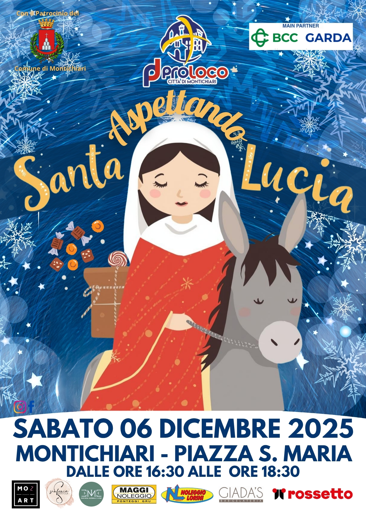 Santa Lucia arriva prima a Montichiari con la Pro Loco Città di Montichiari: sabato 6 dicembre dalle 16,30 in Piazza S. Maria evento per tutti i bimbi per accendere la magia del Natale.Verranno distribuite caramelle a tutti i presenti e si potrà assistere all'arrivo della santa più famoso dell'infanzia con il suo asinello.