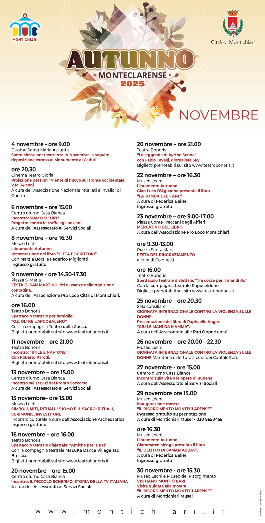 Cinema, libri, feste a tema, arte, sociale, svago e divertimenti sono tanti i motivi per partecipare ad Autunno Monteclarense 2025, il cui calendario del mese di novembre è stato definito dall'Assessorato alla Cultura in collaborazione con le realtà del territorio. In allegato l'intero programma di manifestazioni.